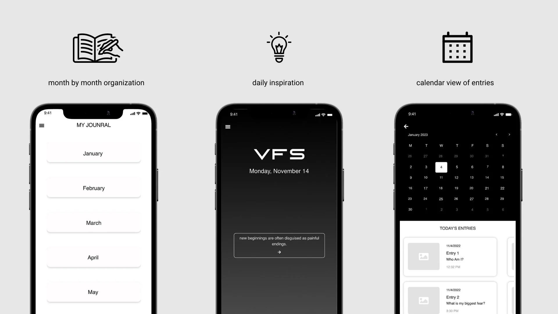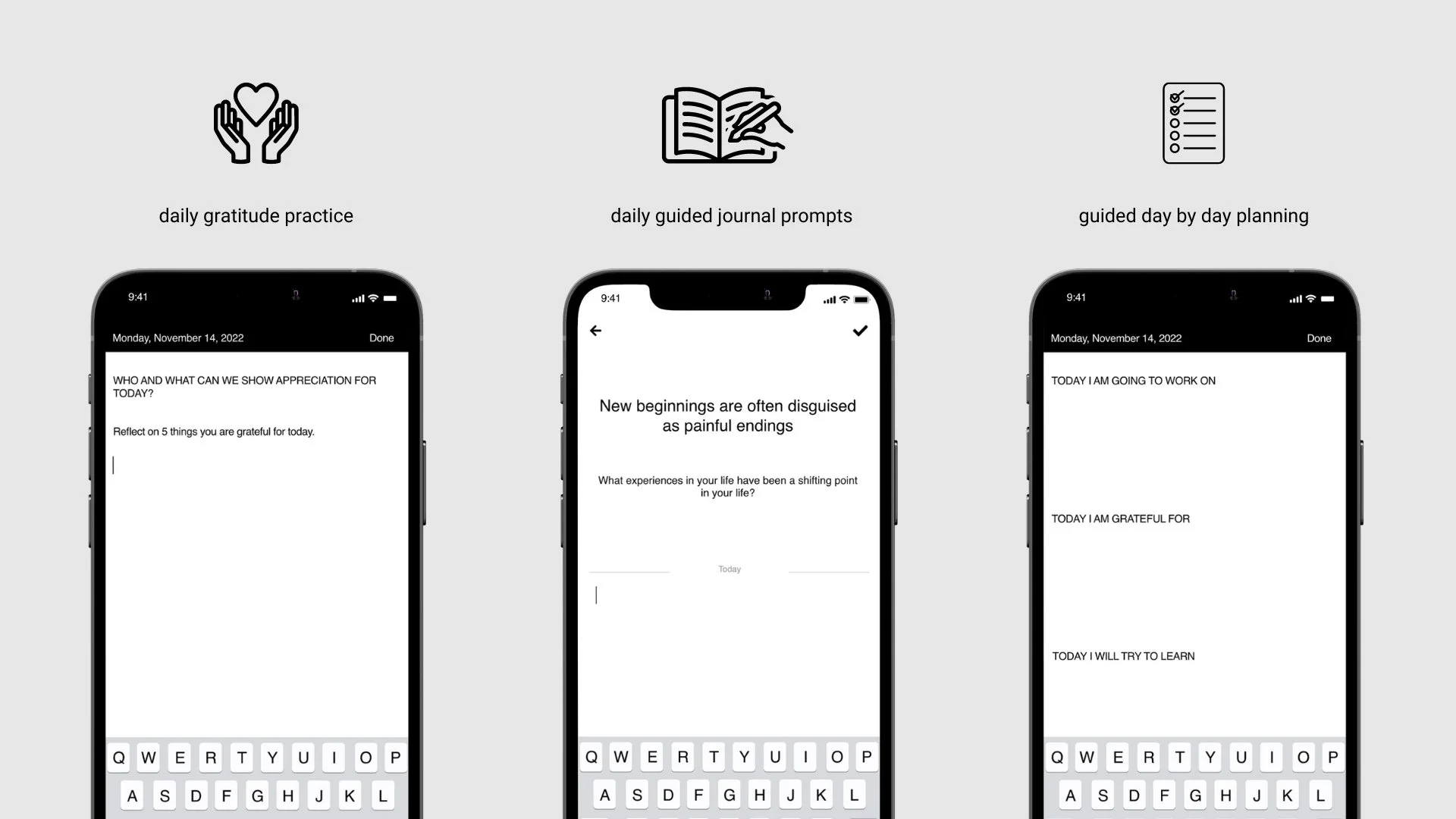 A main function of this application was a personal digital journal. The purpose of this journal was to work on self development. This section of the app has many features including: daily guided prompts, day by day planning, calendar entry, daily inspiration, gratitude practice, and much more.